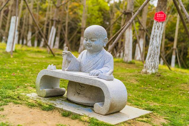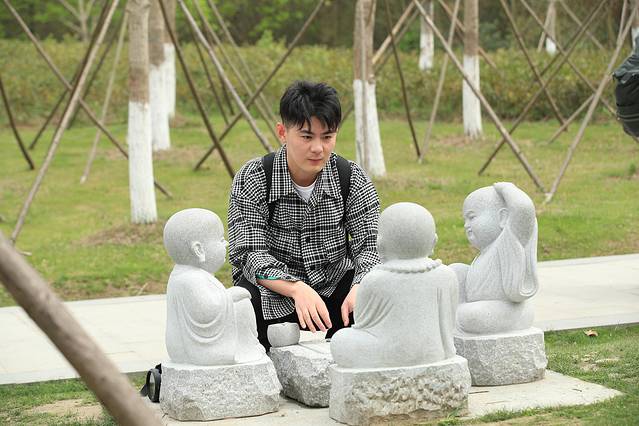 继续往前走,可以看见道路两侧有很多石雕,许多小和尚正在做着自己的事情,有写字的,有下棋的,我端坐在他们旁边,假装互动着。