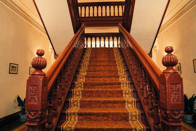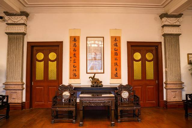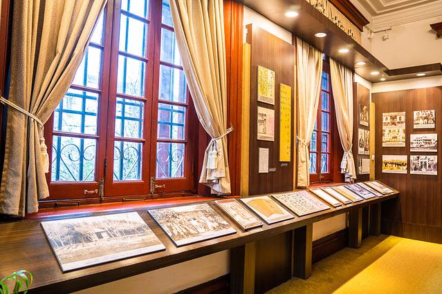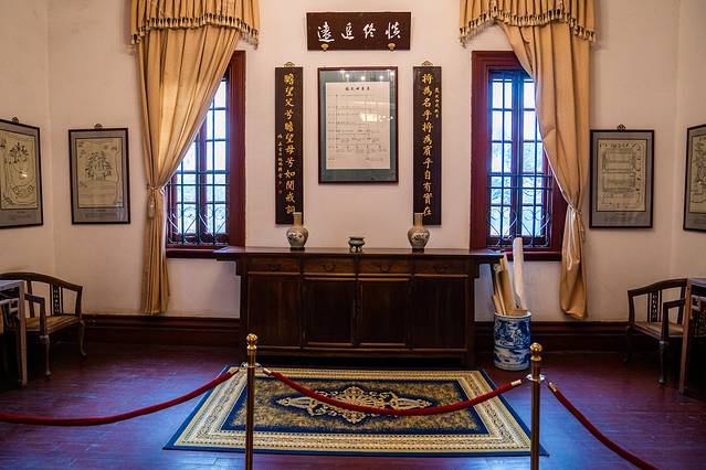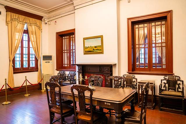 二楼的桌椅看起来都很奢华,东西摆放的很整齐,四周被护栏拦住,不可以接近,远处观看一下这里,我来的时候,也有学校组织参观活动,看样子这里也是学校、机关单位学习参观的地方。