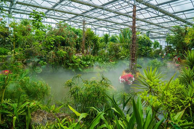 立刻水果谷,来到旁边的热带名花雨林馆,这个由人工模拟热带雨林环境的景观玻璃温室,占地约5000平方米。馆内采用生态园林的艺术手法,真实的再现了南美亚马逊热带雨林的秘境。集中展现了独木成林、绞杀、板根、老茎生花、滴水叶尖等热带雨林的十大典型特征。