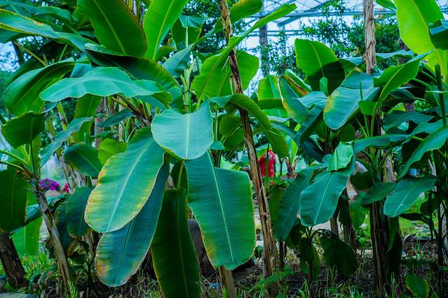 走进绿博园的第一个场馆,热带水果谷。这是一座人工模拟热带环境的玻璃景观温室,占地5000平方米,馆内有菠萝蜜、荔枝、龙眼、芒果、柠檬、杨桃、番石榴、木瓜等数十种热带水果齐聚一堂。中间围绕着一个长圆形人工湖,而湖的中间,是两个相连着的月牙形小岛,岛上是三五成群的香蕉树,故也由此得名“香蕉岛”。