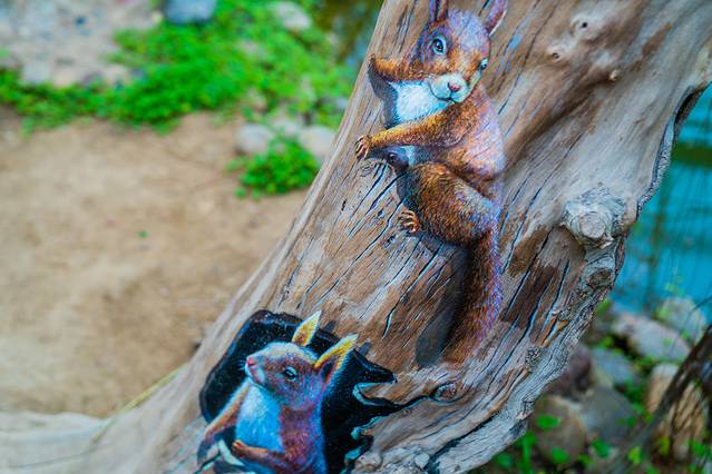 园子里,有许多阿姨穿着大红色的衣服正在拍照,也不知道为什么那个年纪的阿姨很喜欢穿红色,而且很统一。大红色的衣服和绿油油的热带植物,形成了鲜明的对比。树木上,也雕刻着许多小动物的模样,让这个静态的水果园里有着一份生气。