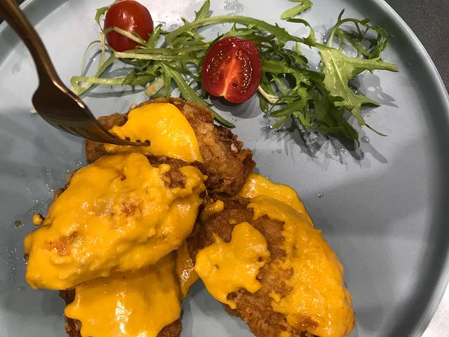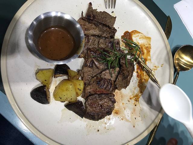 这家餐厅在避暑山庄景区附近,走路10分钟左右。餐厅里面的装修设计,比较年轻化,很有特色。可能因为是西餐,加上餐饮环境花了功夫,菜品相对于火锅店并不算便宜,人均差不多150元,一开始点菜,并不抱太大希望,但是上菜和品尝后,发现口感还是很不错的,比如鸡翅上面洒上了蛋黄酱,牛排的口感也不错(但不是整块上,切好的),榴莲披萨里榴莲分量给的很足,每一小块上一定有榴莲。所以价格这块还是ok的。
