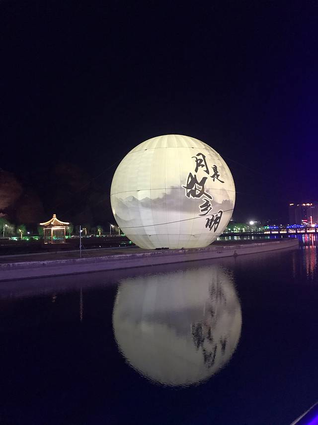 在酒店旁边溜达,无意中发现一个大球,才走进这个公园,大球是一个立在水中的超级大而且明亮的白月亮,上面写着“月是故乡明”,倒影也在水中呈现,特别美!