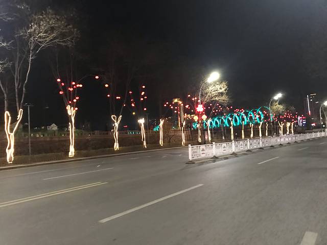 承德晚上的夜景还是很美的,树上还有铁轨改造的步行桥上,都有很多装饰彩灯,比白天更好看。