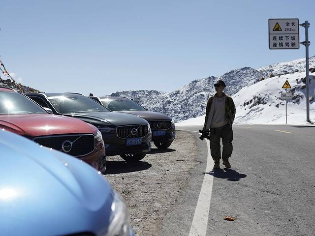驱车前行,时而会乌云满天,时而路过依旧干枯的树林,冰冷的雪山清晰的像是一伸出手就能碰到,往往却能在下一个转弯处遇上阳光明媚的好天气。318国道蜿蜒曲折,虽然路况良好,但要一直谨慎小心驾驶,好在xc60从T5车型开始,就配置Pilot Assist领航辅助系统,0-130公里/小时内辅助加速、刹车和转向功能,让我这一路从容了许多。