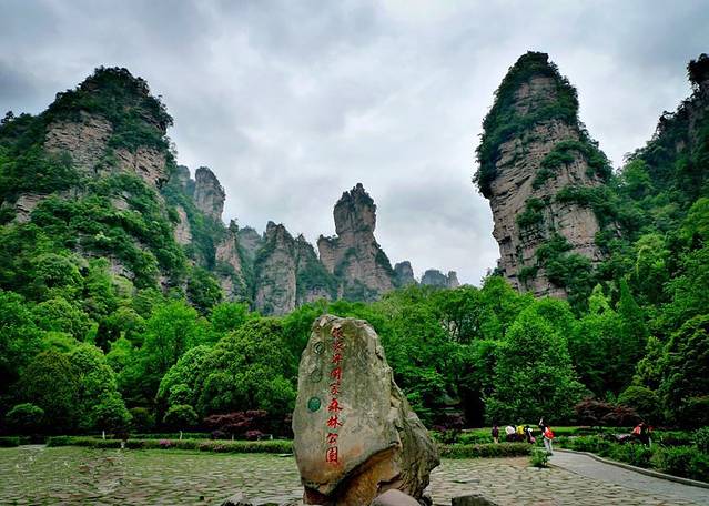 《张家界马鬃岭》1979年作,这是当时吴冠中在张家界画的水墨画,在他回京后,就把他在张家界的新发现告诉了湘西籍艺术大师黄永玉,黄永玉又告诉了香港摄影大师陈复礼。因为三位大师在海内外的影响力,张家界从此走出深闺,并名扬海外。所以,画家吴冠是使张家界风光为世人所知的第一人。每去一个地方,我都想知道其中的一些故事,所以游完张家界后,回来特意在网上搜查了一番张家界与吴冠中的故事渊源。还是言归正传,继续讲述我的此次张家界旅行。从森林公园门口进来,我们首先到达的是大氧吧广场。