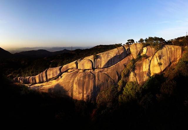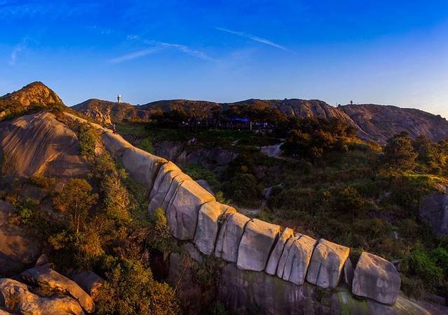 龙脊位于大罗山景区的中心,由23块形状相似的岩石组成,其长约40米,宽约5米,最高约8米,因其形状犹如巨龙的龙脊骨,故称为龙脊,龙脊属于花岗岩地貌,典型的火山岩构造,其形成距今约1.2亿年左右,龙脊是大罗山景点的精华之一。