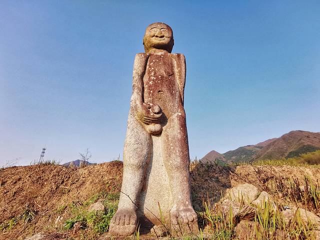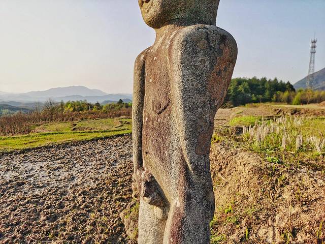 三节村的这尊石像呈光头躶体形态,高约2米左右,雕刻线条简洁,但姿态和面目表情都清晰可见。