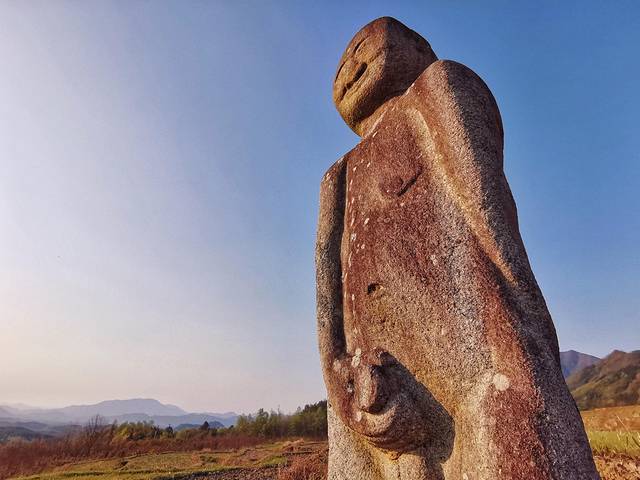在安徽省南部的黄山、宣城等地,散落着数尊神秘的古代石像,图中就是其中的一座,位于旌德县白地镇三节村的田野深处。