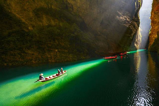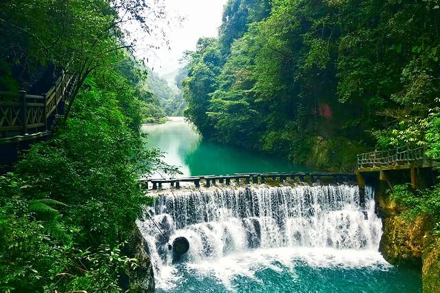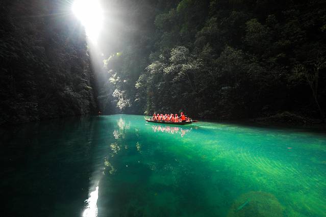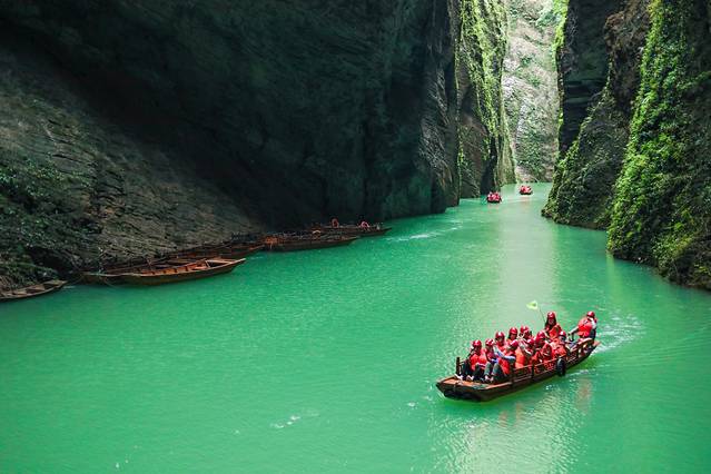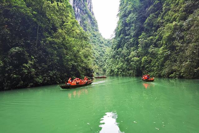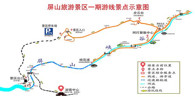 4.屏山峡谷的游览顺序是先下后上。从山顶下台阶的时候注意保护膝盖(可戴护膝),时间大约需要1小时,中途可在步云亭休息;到达谷底后就可以看到阿打铺子,游客可以在这里休息、拍照、补充能量,此处有零食售卖和服装出租;过了阿打铺子,经过两座吊桥,步行10分钟到达桃花渡码头,若游客较多时需要排队等候上船;船程为12分钟左右,从风景体验的角度这段船程是整个景区最为精华的部分;在滚龙坝码头下船,穿过傩愿洞,再走一段路即到杜宇楼出口,这段路大约需要半小时,在洞里爬的时候不要一口气,里面分为三段,爬完一段可以去观景洞口看看峡谷风景,这样不会觉得累。如果是自驾,从杜宇楼出来以后,司机需要乘坐摆渡车前往入口停车场取车,5元/人。
