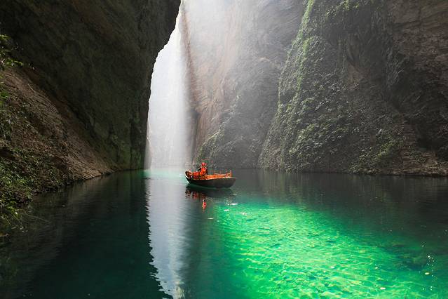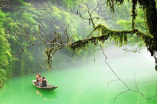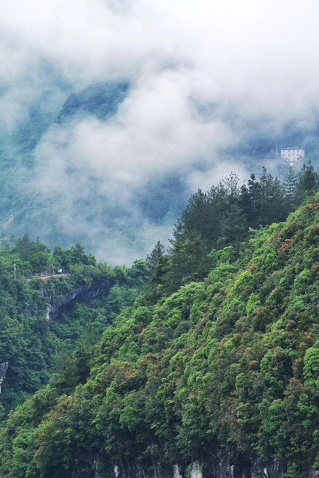 3.雨后山间云雾缭绕,坐船穿行峡谷时,两侧的崖壁上能看到瀑布,是与晴天不同的风景。