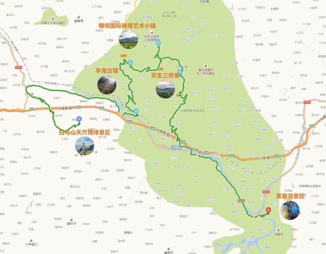 线路:白马山天尺情缘景区——羊角古镇——懒坝国际禅境艺术度假区——仙女山景区区——天生三桥景——芙蓉洞景区