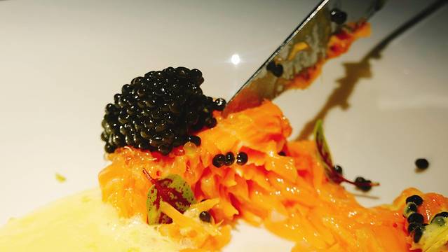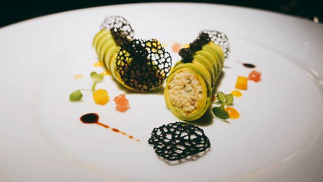 海胆被啫喱包裹,牛油果切片夹紧蟹肉洒满特级鱼子酱,经典的黑松露塔像是严防死守的城堡,黑椒汁与泡沫的搭配让龙虾的呈现仿若天地创始之初。