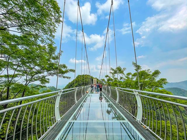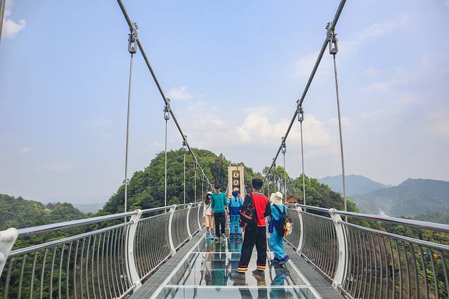 这个玻璃桥横跨在天龙山主峰和阿婆迹山峰之间,玻璃桥全长130米,从最高点到最低点是176米,站在桥上即可直观断崖峡谷,俯瞰山川美景。