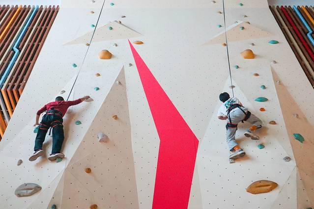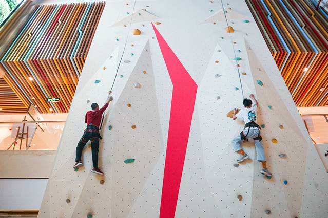 走进攀岩小镇,便能看到各种高颜值的攀岩基地和各种游乐设施,有的小孩正在挑战高难度的攀岩运动,有的坐在草坪上和父母玩闹,非常和谐又有爱的一幅画面。
