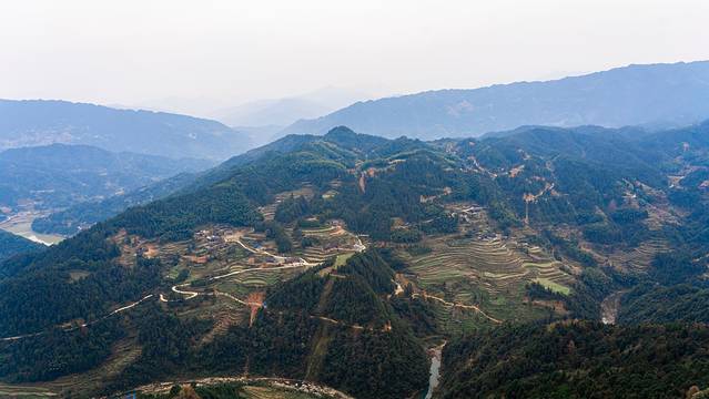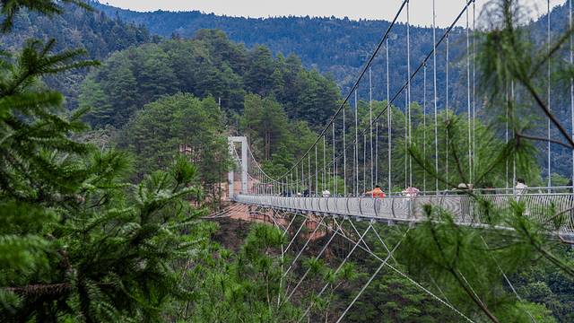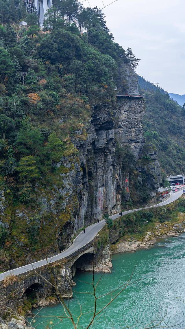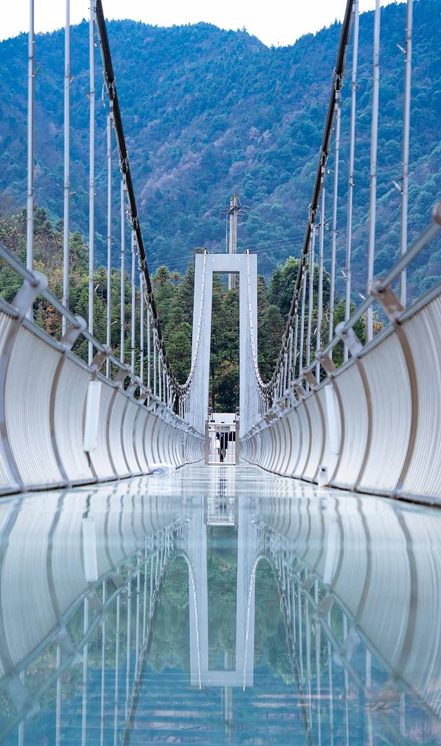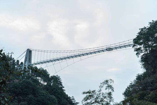这里山高、峰秀、石奇、水清、林深,在山脚抬头就能看到玻璃桥,一路陡峭的山路让我这个每天不上五千步的人大腿开始隐隐发酸,在毅力的作用下终是来到桥头。漫步在玻璃桥上俯览山川河流,顿时觉得心胸开阔,时不时传来惊恐的尖叫声,走到龙凤玻璃观景太,这里山脚一片梯田,我还在山林之中发现一幢木屋,逃离喧嚣林中居士既视感。如果运气好能看到翻腾的云海。