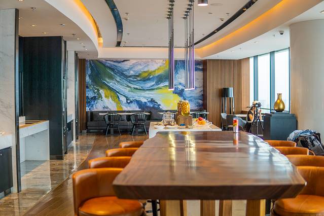 我这次入住的是徐州最高的徐州苏宁凯悦酒店。酒店的建筑外观和室内设计,借鉴了两汉文化和云龙湖,我个人非常喜欢。42层是大堂和大堂酒廊,43层至59层是客房,60层是悦享中餐厅。窗外的视野无敌,不仅能俯瞰不远处的云龙湖美景,晚上窗外美丽的城市夜景,也尽收眼底。在这样的云端酒店里入睡和享受美食,真是一种别致的体验。