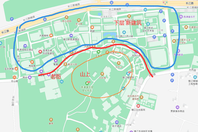 红色线条:西津渡老街,游玩救生会(收费)、昭关石塔、观音洞和唐宋元明清五个朝代的石阶,街道两边都是小吃商铺等。