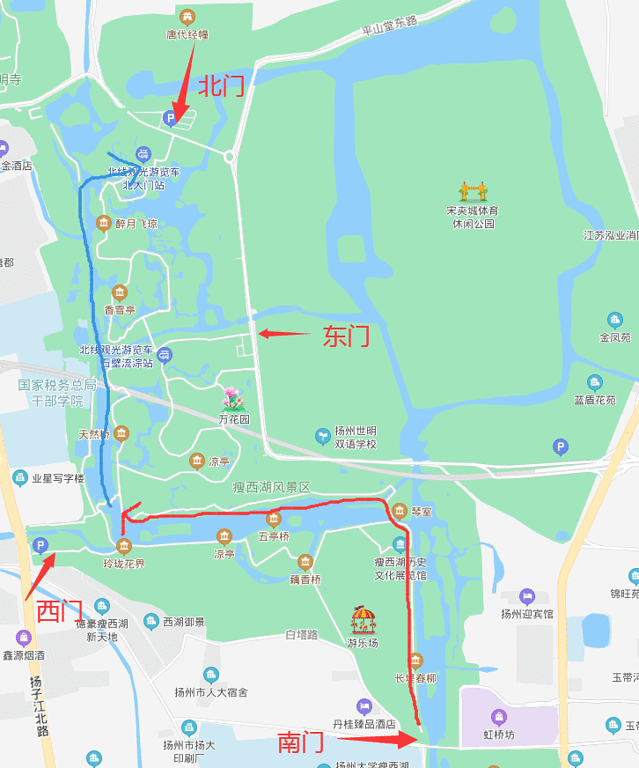 节假日,来瘦西湖最适合还是共享单车或者步行吧。