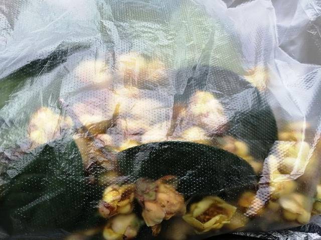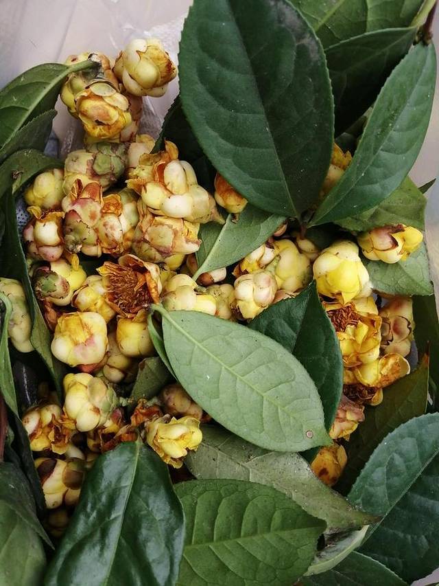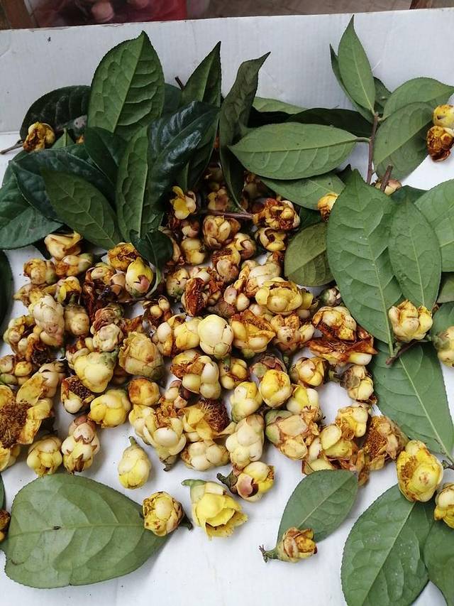 在西津生态鱼生馆吃过饭,老板杜总给了我一袋新鲜金花茶,打开一看,这些金花茶很多带着叶子,这花金黄色,耀眼夺目,非常新鲜。杜总说,是他朋友从自己的山庄摘来的,给我泡茶,最好连叶子一起煮茶喝,效果更好。
