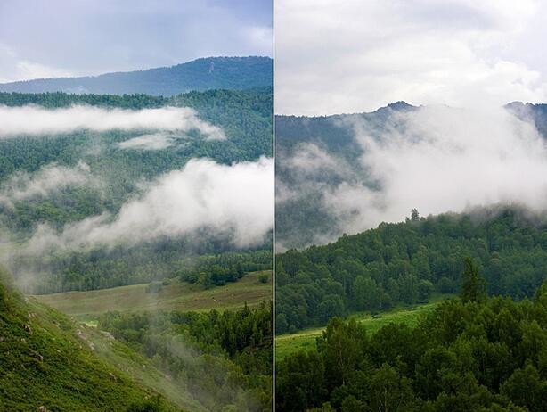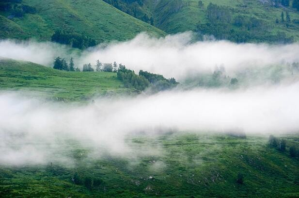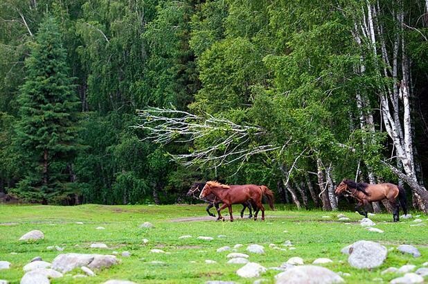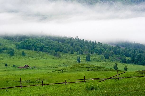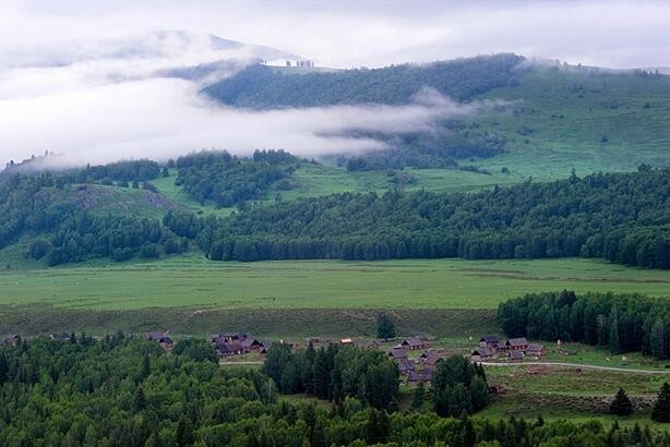 禾木村有着最自然、最原始的山野风光,风景独特而优美。来到村里,首先进入我们视野的就是那一栋栋的小木屋和成群结队的牧群,与远山、森林、草地、蓝天白云构成了独特的自然与文化景观。这些小木屋已成为图瓦人的标志,特别的原始古朴,并带有游牧民族的传统特征。夏日的清晨,薄雾萦绕,禾木乡的小河、木房、炊烟、桦林及山坡上的牛羊……汇集成一幅幅优美、清凉的风景画。