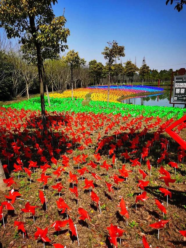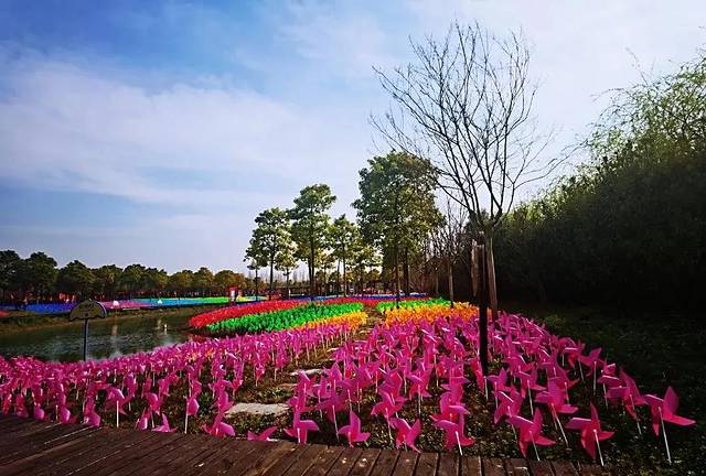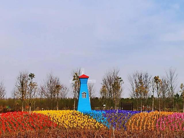 风车旋转的地方都有一份快乐的春意和童趣的梦,红的、蓝的、黄的、紫的,几万只五颜六色、造型各异的风车