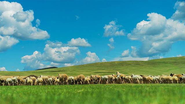 草原上,羊群滚滚流动着,仿佛一朵朵飘逸的云,在层澜叠涌的绿浪里泛起微漪。