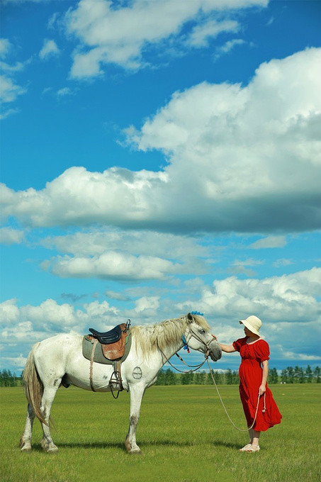 内蒙的马儿不如新疆的那么高大,但是却很温顺,轻轻拉一下绳子,便会跟着你往前走,天空明朗,一碧千里,一人一马,想想这个画面心境都会宽广起来。