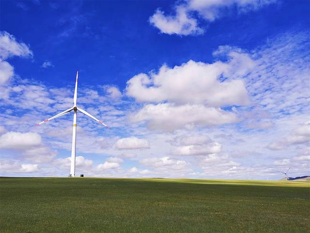 星星点点的牛羊散落在绿色草坡上,湛蓝如洗的天空飘着朵朵白云,山顶的风车慢悠悠的转着,随手一拍满满都是北海道的画面感。