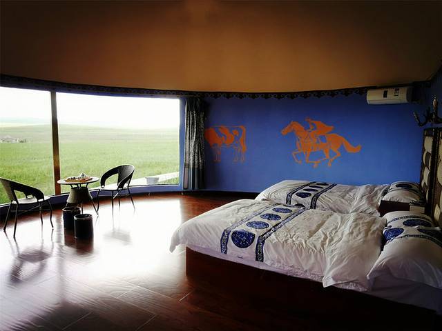 草原上的蒙古包,很多年前在青海湖边曾经体验过,一个小小的蒙古包里两个钢丝床,没有厕所,没有热水。而当我踏进绿野大营的蒙古包时,竟然有空调,有独立卫生间还有热水器,大大的落地窗躺在床上就可以看草原日出,简直就是天堂好吗!