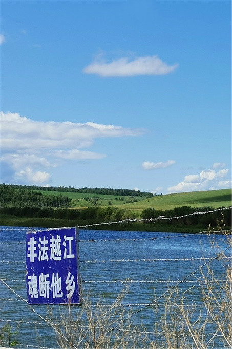 卡线公路紧贴着界河和“铁丝网”向前延伸,远远窥视一眼对岸的俄罗斯,人迹罕至,安和静好,也只有“非法越境,魂断他乡”的警示标语无不显示着这条边防公路的严肃和权威!