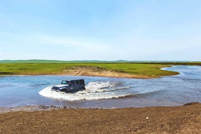 因为还没到汛期,莫日格勒河的河水并不宽阔,李哥载着我们和一群马儿一起漫步草原,也算是我们此行最独特的体验了。后来还见到别的车过河,赶紧拍了一张。