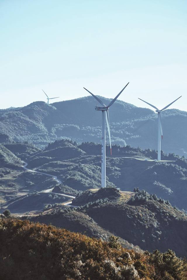山上的视野真的一绝。2号风机的位置可以拍摄公路大片,近处山路崎岖盘旋,远处山峰层峦叠嶂,连绵起伏。风机本体超级大,但远远看去就像小时候拿在手里玩的小风车,呼啦啦的转着。看着看着就哼起了小曲儿~