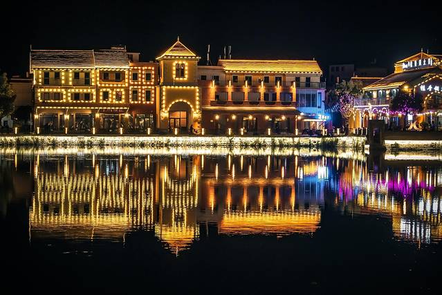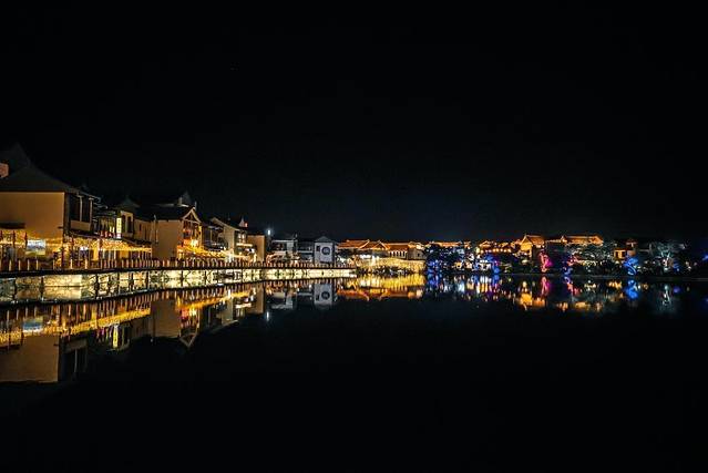 夜晚的湖面虽然一片漆黑什么都看不清,但却变身最完美的镜子。湖边五颜六色的房子,湖上通体金黄的小桥,映出一个绝美的颠倒世界。