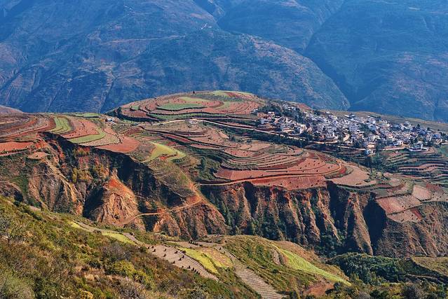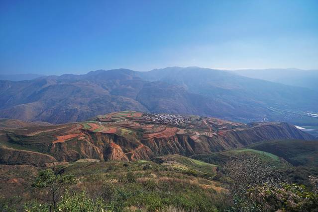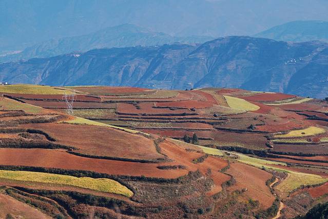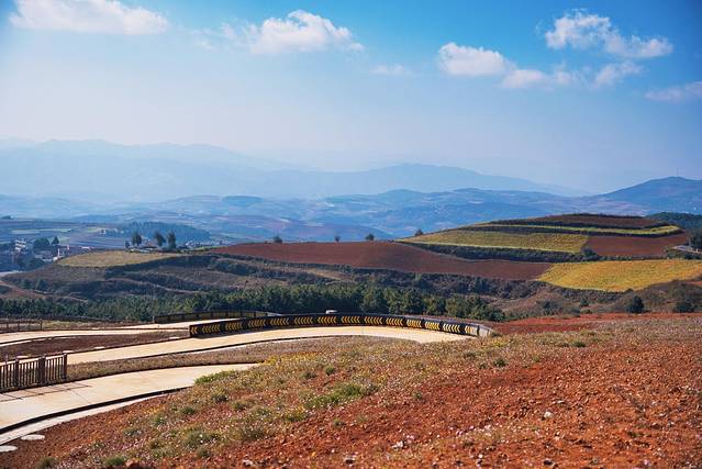 说起来为啥这边的土地是红色的呢?我去百度上科普了一阵。东川属于亚热带和热带气候,千百年来在高温多雨的气候条件下,土壤中就会含有大量的铁、铝成分,所以土壤就会显现出赭红色。据说放眼全球也只有巴西的红土地可以和东川红土地媲美了。