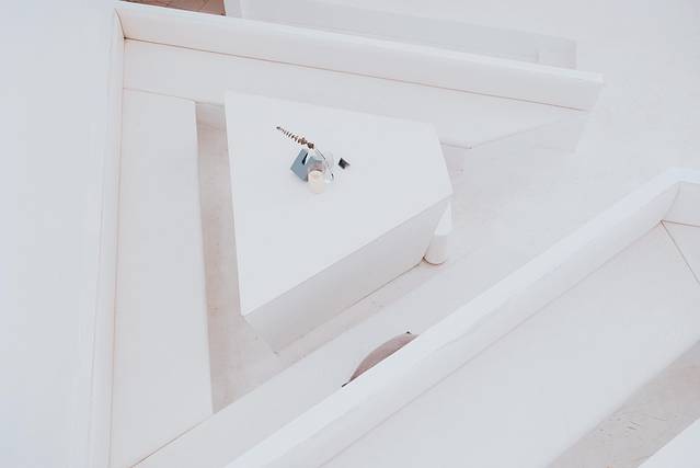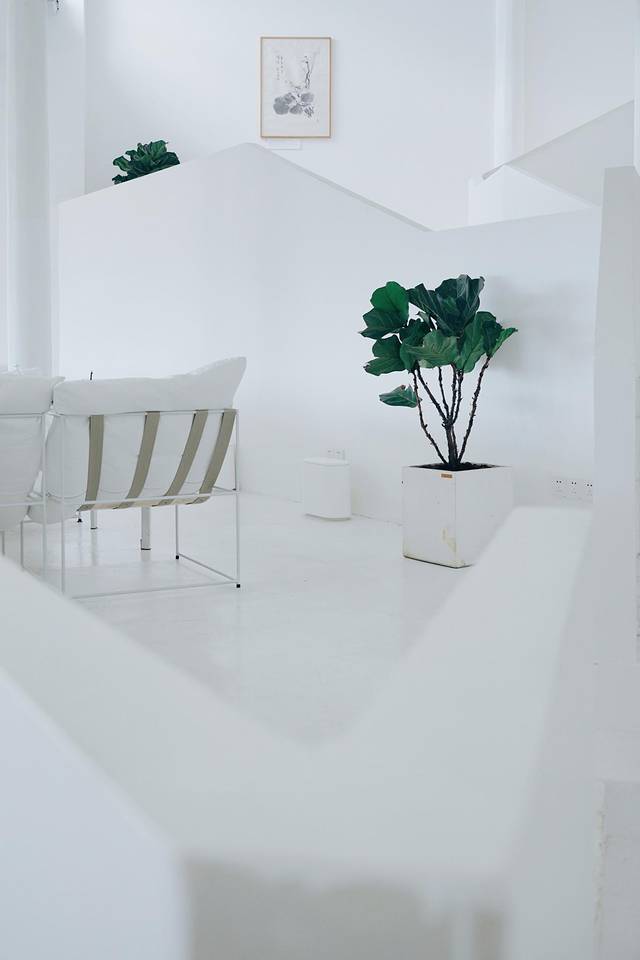 咖啡馆内部是纯白的极简主义,完全靠梁柱的线条和地面的错落来提现建筑之美,让人有种置身美术馆的感觉。
