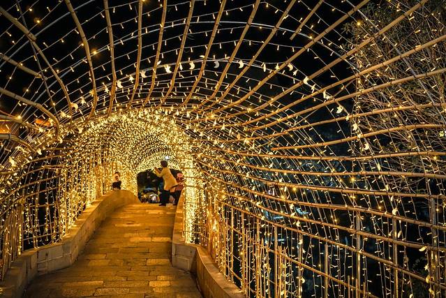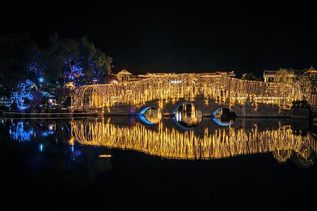 湖上的这座金色“流苏”桥真的绝美!远看像两条小金龙横跨在湖上。到桥上走一走,仿佛漆黑的夜里走在繁星之下,这一片夜空都被照亮了。