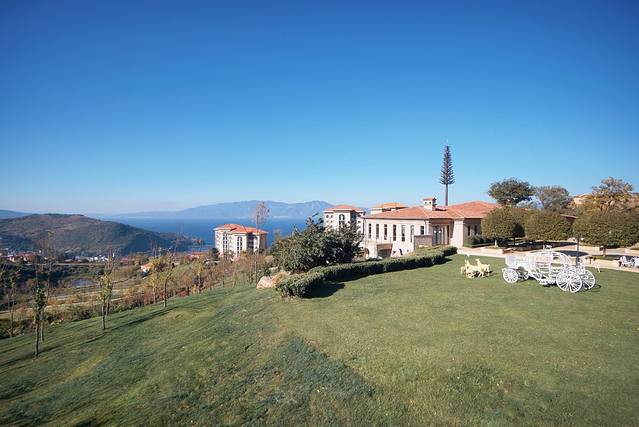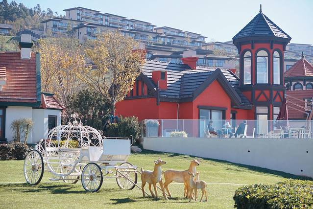 度假村有一个可以进入太阳山小镇的专属入口。拾级而下,首先就见到一个观景平台。与其说这个平台是观湖的,不如说是观度假区的。往湖区方向看,是一片巨大的草坪,露出一小片的抚仙湖和湖边的希尔顿酒店。回头往另一个方向看,就是依山而建错落有致的别墅群。