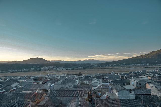 蓝天白云,云卷云舒,静静等待黄昏的到来。稻田前的小路是出入古镇的要道,车来车往。这个场景的变换就很适合拍延时摄影。我自然也是拍了的,然而忘记了透过玻璃拍摄的话,天黑之后玻璃就成了镜子,拍到的全是服务员忙碌的身影和我时不时探头看相机的脑袋…