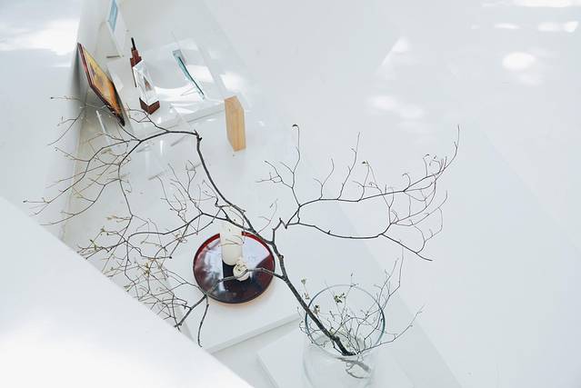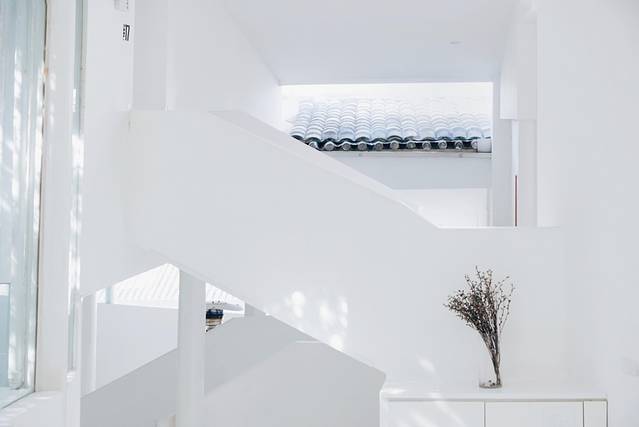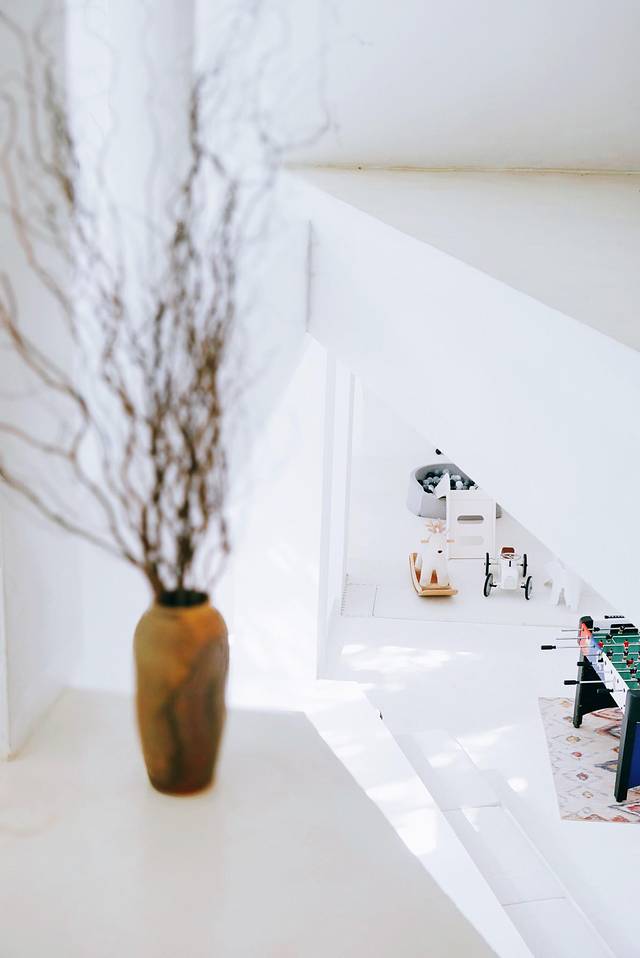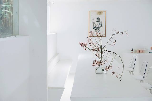大量的白色墙壁,地板,天花板营造出一个特别亮堂的环境。偌大的白色空间只装点着一些绿植。同时靠着不同位置的窗户实现了一些借景。艺术就是留白在这里也是提现的淋漓尽致。