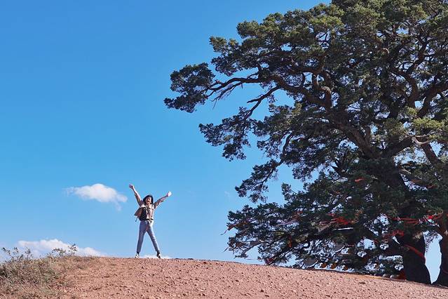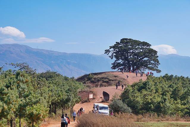 这颗老龙树还是很有气势的,独它一颗伫立在山的尽头,树形也十分优美。不过想要跟这颗老树近距离接触需要走一段挺长的泥路,那叫一个尘土飞扬啊~