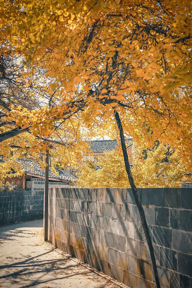 往年11月底的银杏村应该是一片金黄了。然而今年是个闰二月,加上雨水多,整个银杏村有些青黄不接。黄透了的银杏树需要寻找一下,但村里银杏树的规模还是很可观的,大片片银杏叶还是很好捕捉。剩下的就靠强大的PS来还原这个金黄童话世界应有的样子吧。