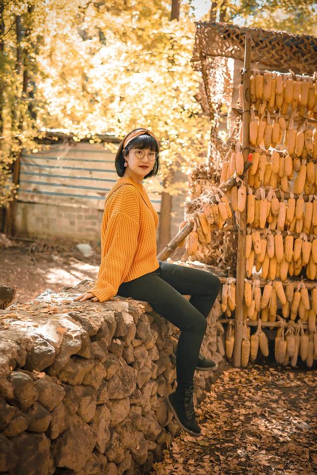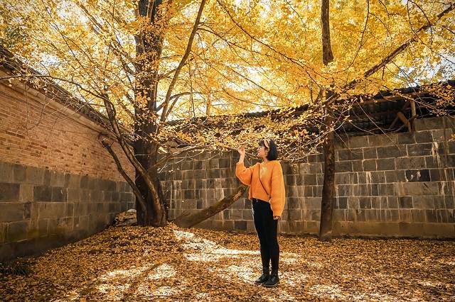 站在树下就可以拍出一张很不错的人像,如果有为艺术献身的精神可以躺在银杏地毯上的话,俯拍的效果应该也是非常出片的。(穿毛衣的我表示实在躺不下去…)