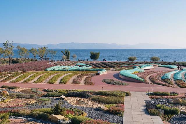说起来最初让我种草抚仙湖的就是一张广龙抚海湾的花海的航拍照。为此我还买了个航拍器想来这里大展拳脚。实际探访之后,发现这里是一个季节限定的景点。夏天照片上的它绝对美的不要不要的!排列修剪极度规整的花海绝对治愈强迫症,另外大片的湖边薰衣草也是菲林杀手。