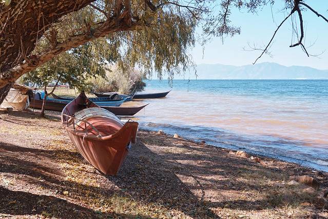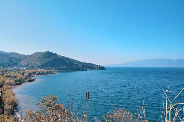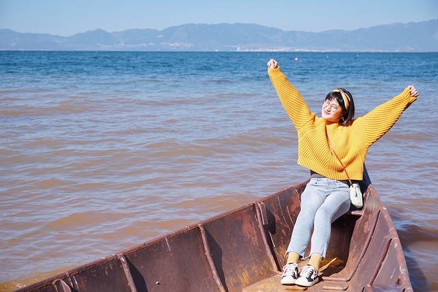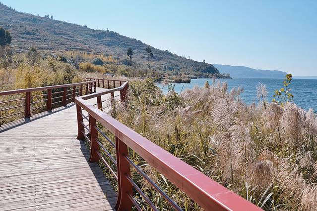 虽说抚仙湖还算小众,但这里的旅游设施已经建设的很不错了。如果有足够的时间和体力徒步环湖的话,那么沿湖将近30公里的步行道一定能玩的很尽兴,栈道的名字很文艺——时光栈道。时间有限的话,可以考虑从大湾村附近的路口进入栈道,然后往仙湖湾公园方向走。这样的话,会经过一片停泊的渔船,还蛮适合拍照的。栈道上观湖的视野超开阔,碧蓝碧蓝的湖水,真的和大海别无二致。连浅滩看着都跟沙滩似的。