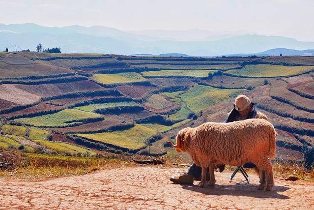 乐谱凹是东川红土地的最后一站。只要在网上翻看红土地的照片,几乎一定能看见这位爷爷和他牵着的大肥羊或者大黑狗。其实这是两位不同的老爷爷,他俩会轮流坐守乐谱凹,等待游客前来合影。老爷爷看着颇有些百岁老人的感觉,但问了问司机师傅,老爷爷们才70多岁,果然催人老的不止岁月,还有云南的紫外线。