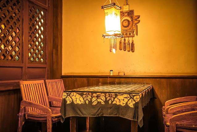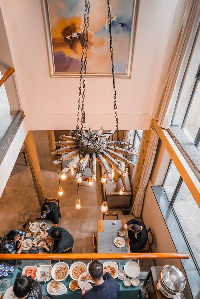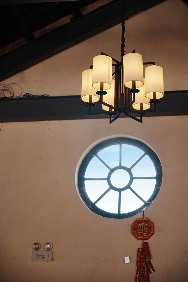 我们住的露台房还是挺古色古香的,但下到客栈的大堂,就会发现这是一间现代又艺术的客栈。大挑空的屋顶挂着一盏太阳花样的吊灯,灯下就是小小的早餐区了。
