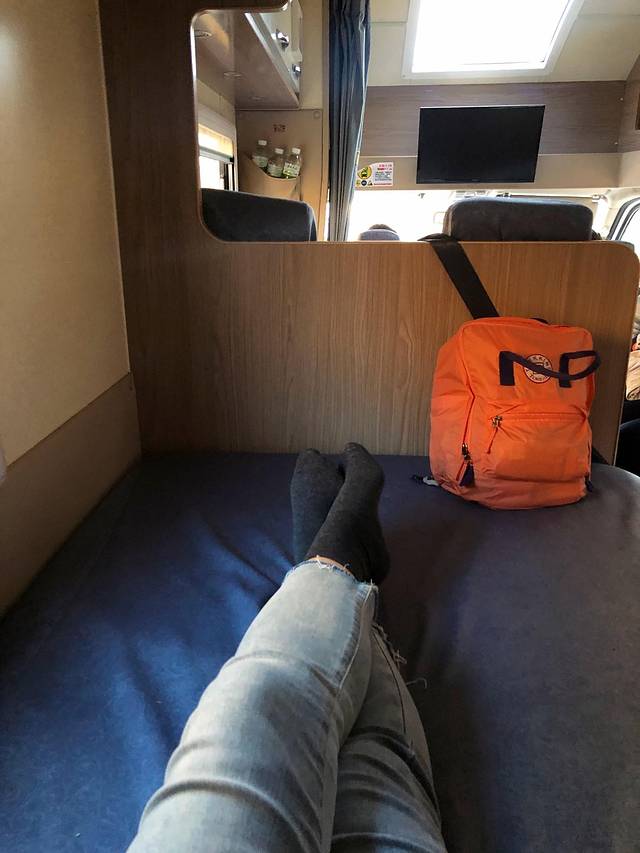 至于房车旅行嘛,先说结论…不推荐。还是乖乖的选普通车型比较好。原本我想的是能在车上补补眠,但实际上短途团的房车床铺似乎不太干净,躺着浑身痒痒。更抓狂的是,颠,超级颠!躺在床上七倒八歪的,根本睡不着。坐在椅子上呢,又因为椅子的方向不全都朝前,每次刹车的时候都坐不住。