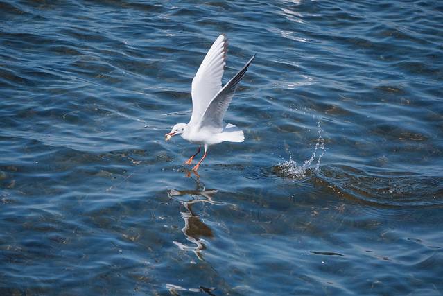 红嘴鸥的接食技能强大。不论食物以什么角度抛向空中,它总能把食物收入嘴里。