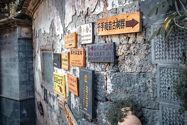 和顺街头巷尾的指路牌好有特色,一块块招牌钉在灰砖墙上,指路的作用怎么样不说,吸睛的效果那是一流的。